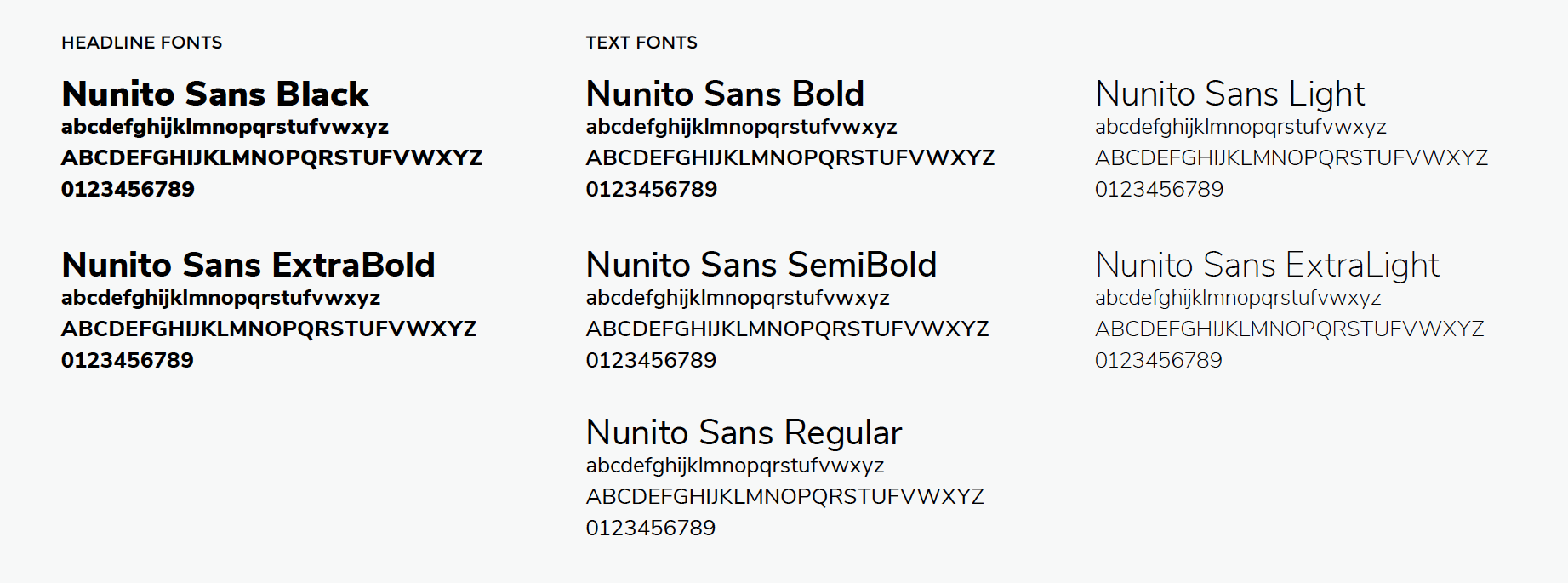 Our font family is Nunito Sans. It should be used for all communications. This is to ensure a consistent look and feel for all literature both off- and online. Use Nunito Sans Black and Nunito Sans ExtraBold as headline fonts only. Bold, semi-bold, regular, light and extra-light can be used for body copy. On the web, 700 and 900 are used for headlines and 300 and 400 are used for body copy.