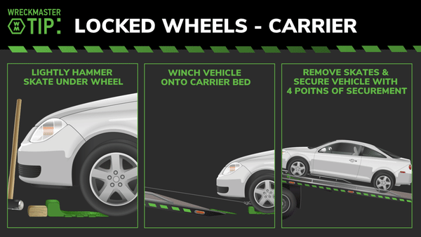 Loading a vehicle with locked wheels on a carrier can be straightforward with the right equipment. The most common and useful tool is the WreckMaster skate. The skates reduce resistance and allow a vehicle to more easily slide along the ground.
