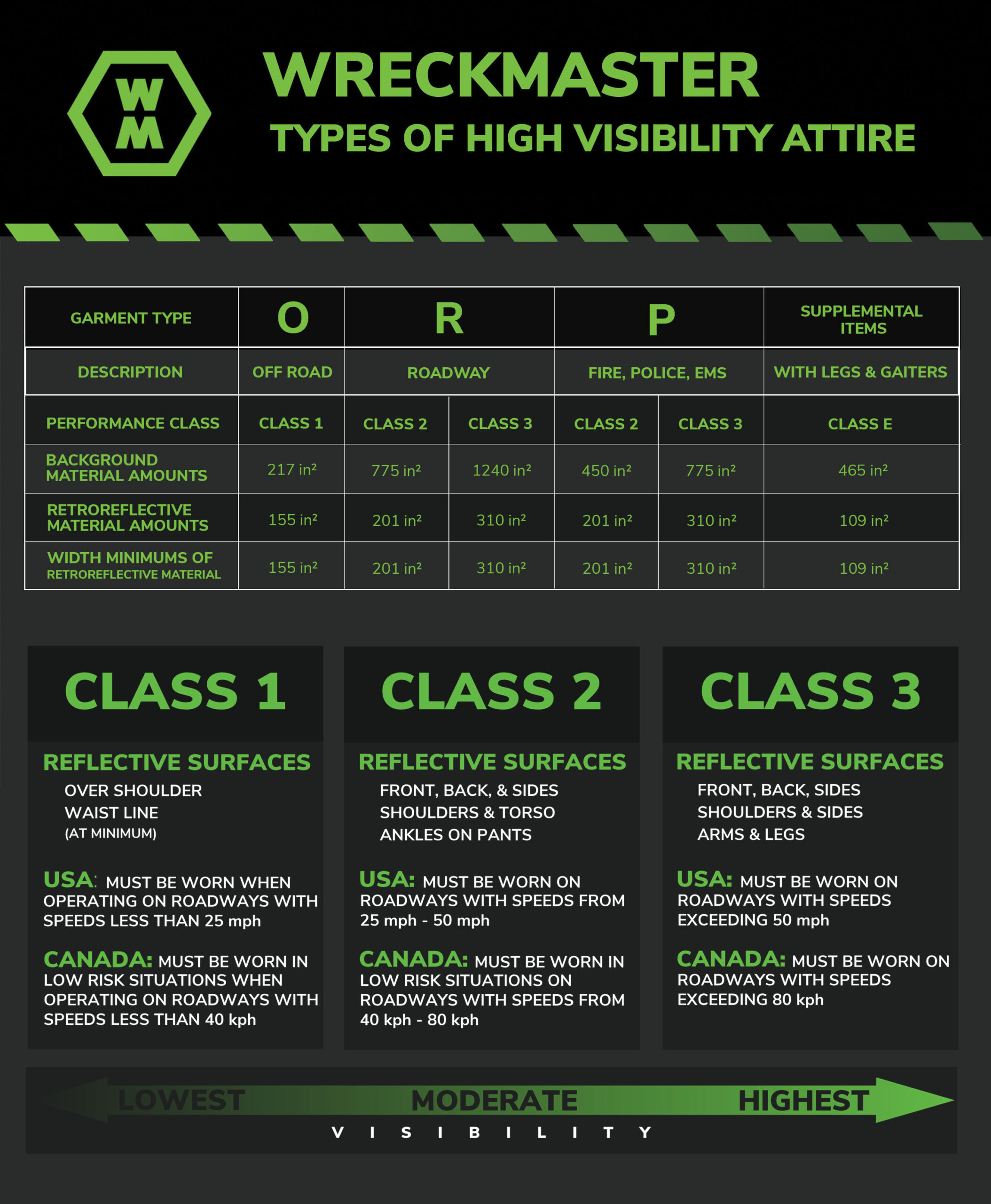 Different variations of high visibility attire are required depending on where you are operating. This is not only a WreckMaster recommendation, this is required by law. In both Canada and the USA, transportation authorities enforce strict regulations for individuals who work roadside. This includes towing operators, regardless of the type of job.