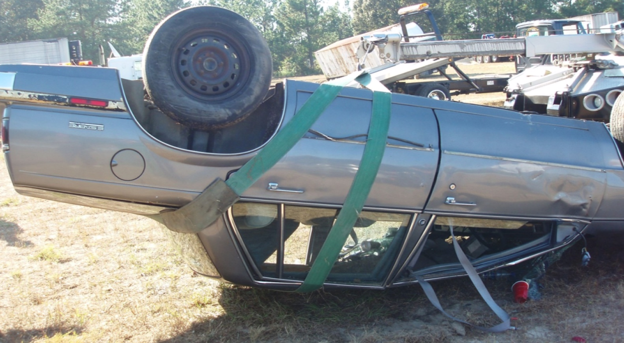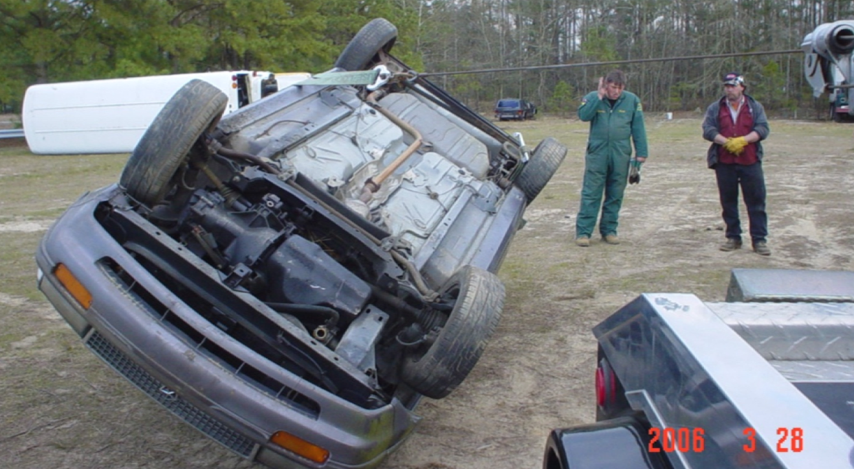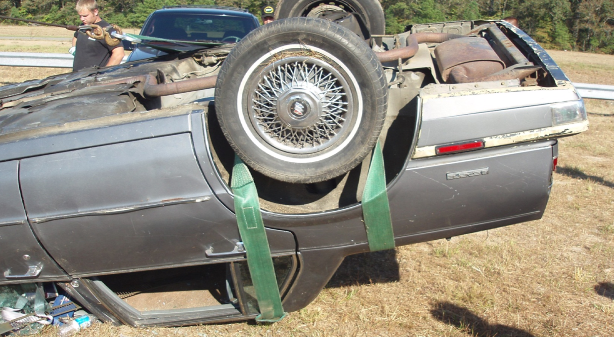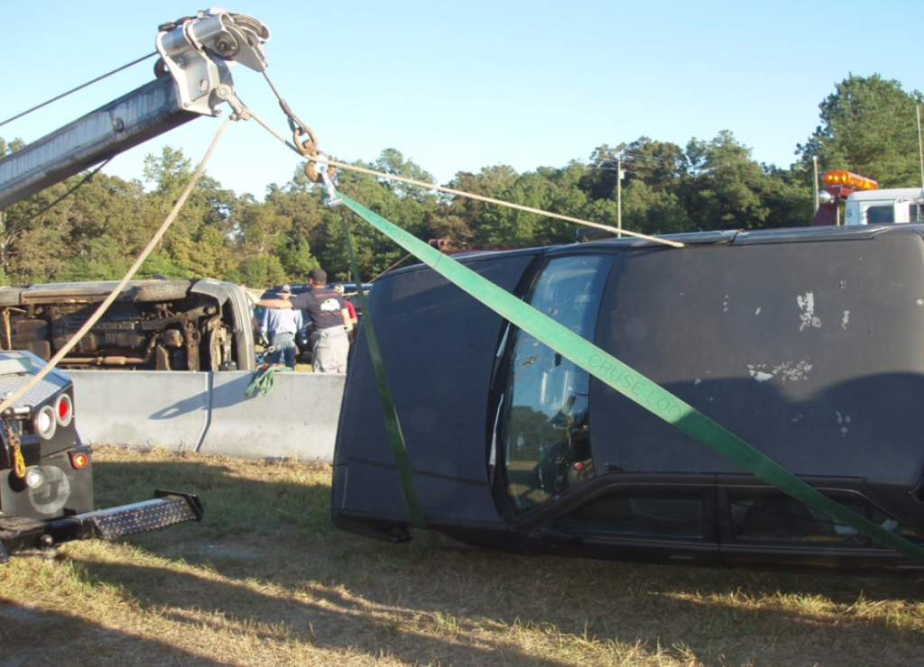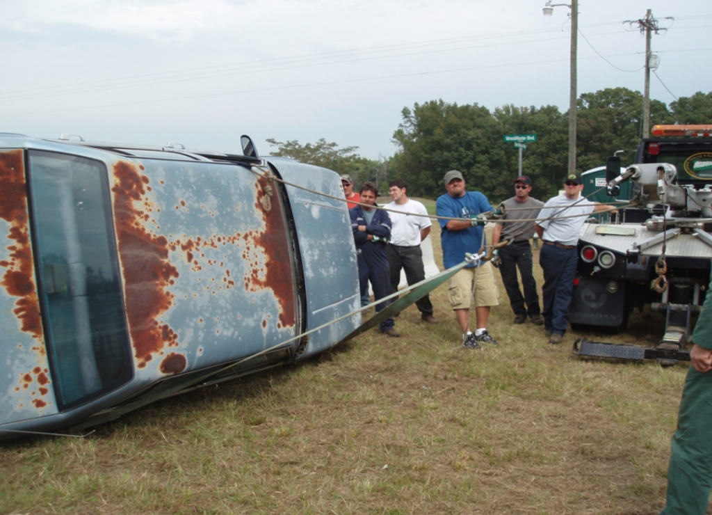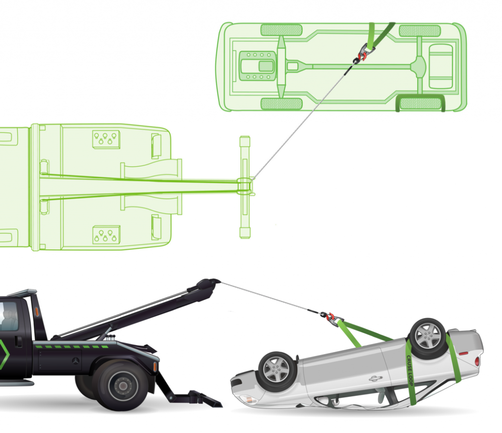 In this technique, we take a strap and wrap it around the wheel and under the roof of the car. Extend your boom, winch in with the winch line, then boom up and the car will flip over behind the tow truck.