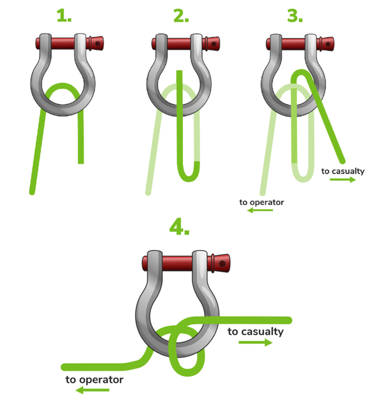 Using a piece of rope and a shackle- take the rope and make a loop, put the eye of the rope up through the shackle, and take the tail and go up through it.